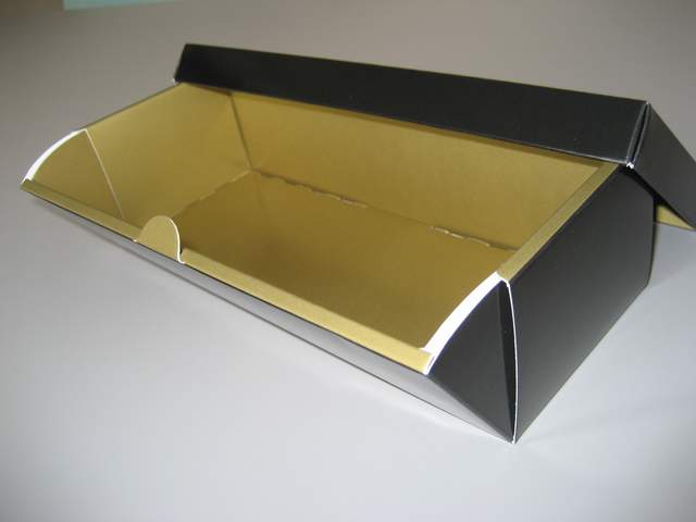 | 黒をベースにし金色の寿司元の文字という豪華な外観になっています。文字も特別に書道家の先生に書いて頂くと言うこだわり | パッケージの内部にも金色を印刷して、外観だけでなく内部にも手を抜かないパッケージ | お客様が商品を取り出す事も考え、パッケージのサイド面が開閉する構造になっている心使い | |