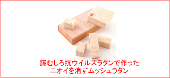 | 製造工程で発生する籐の端材を使用した環境に優しい商品「ムッシュラタン」 薬品等を使用せず、籐本来の性能である消臭殺菌能力を利用した新しい商品で、 中部経済新聞等にも掲載される確かな商品です。 |